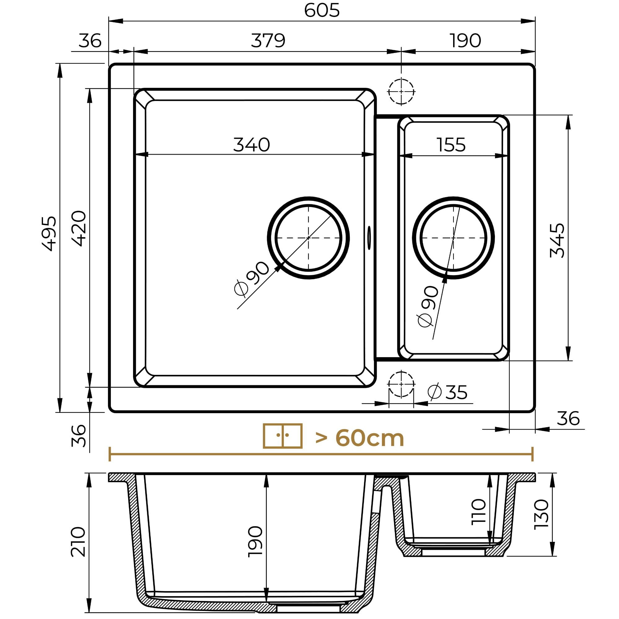 | Do szafki | od 60 cm |