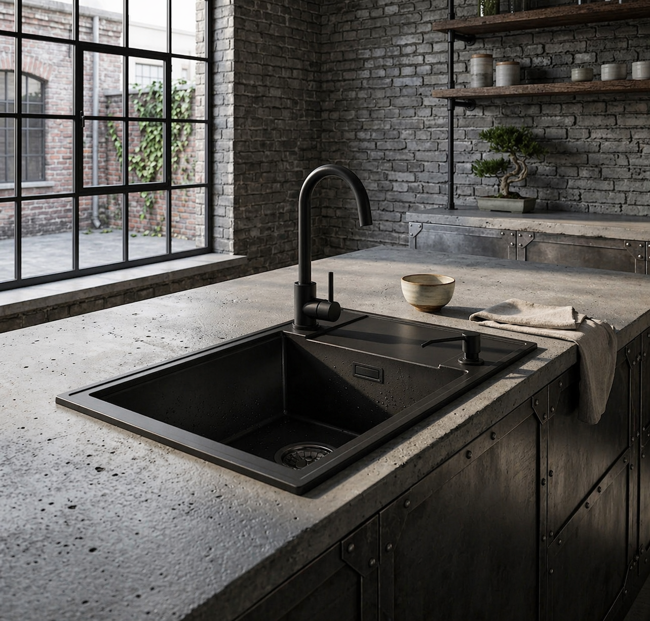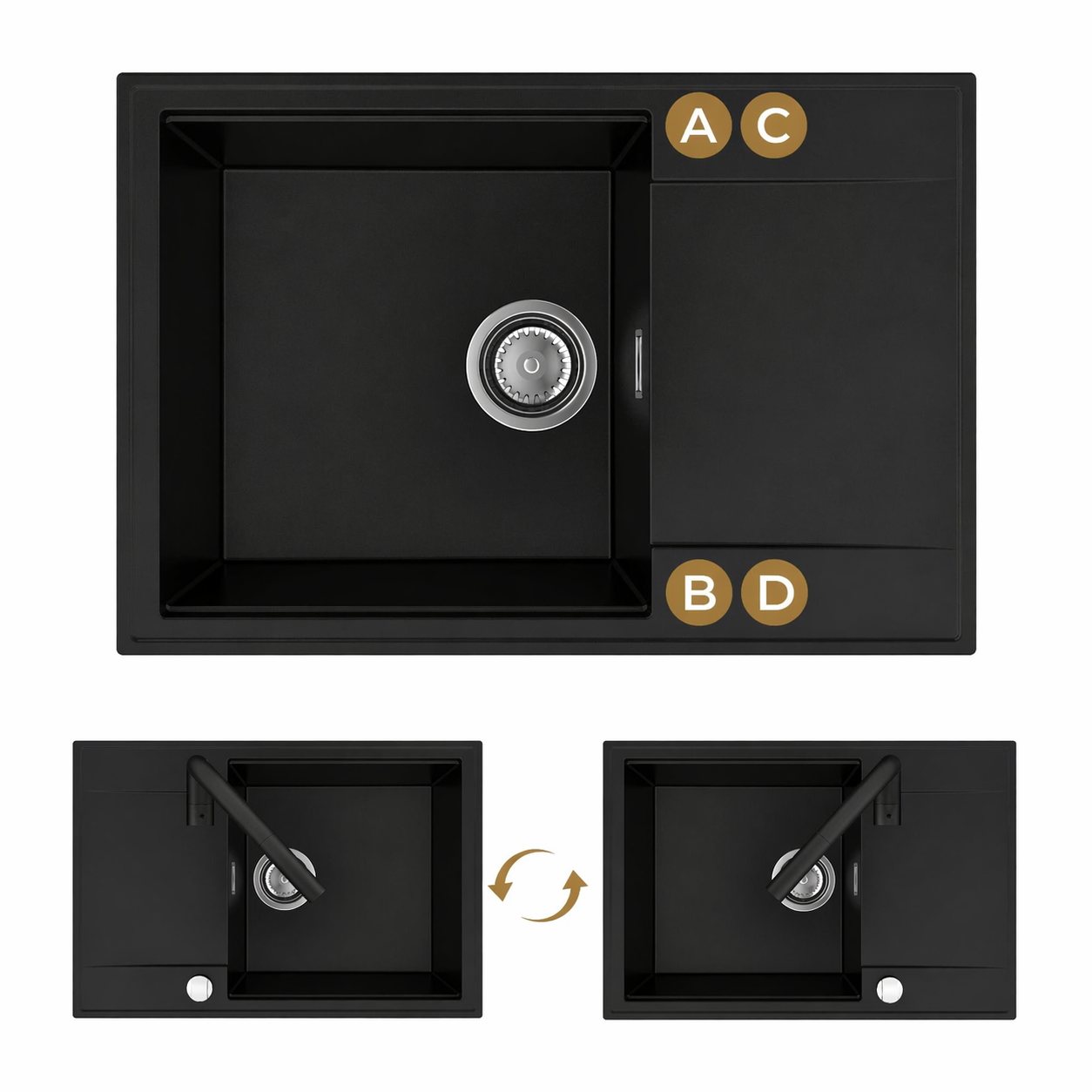 Model LORAL 55 to granitowy zlewozmywak jednokomorowy z ociekaczem w eleganckim czarnym kolorze, który łączy dużą, wygodną komorę, praktyczne rozwiązania oraz wysoką trwałość, dzięki czemu doskonale sprawdzi się w większości kuchni.