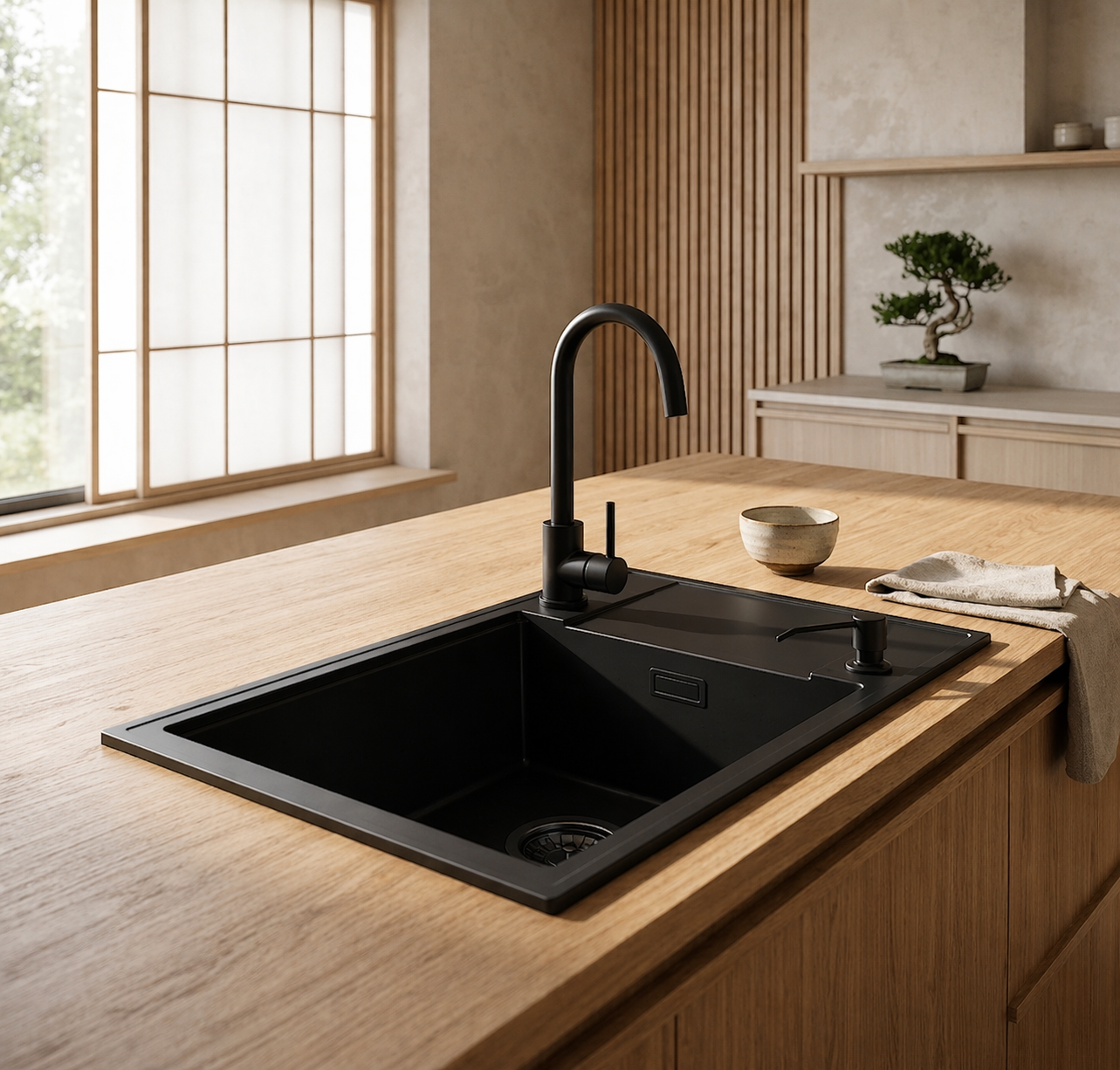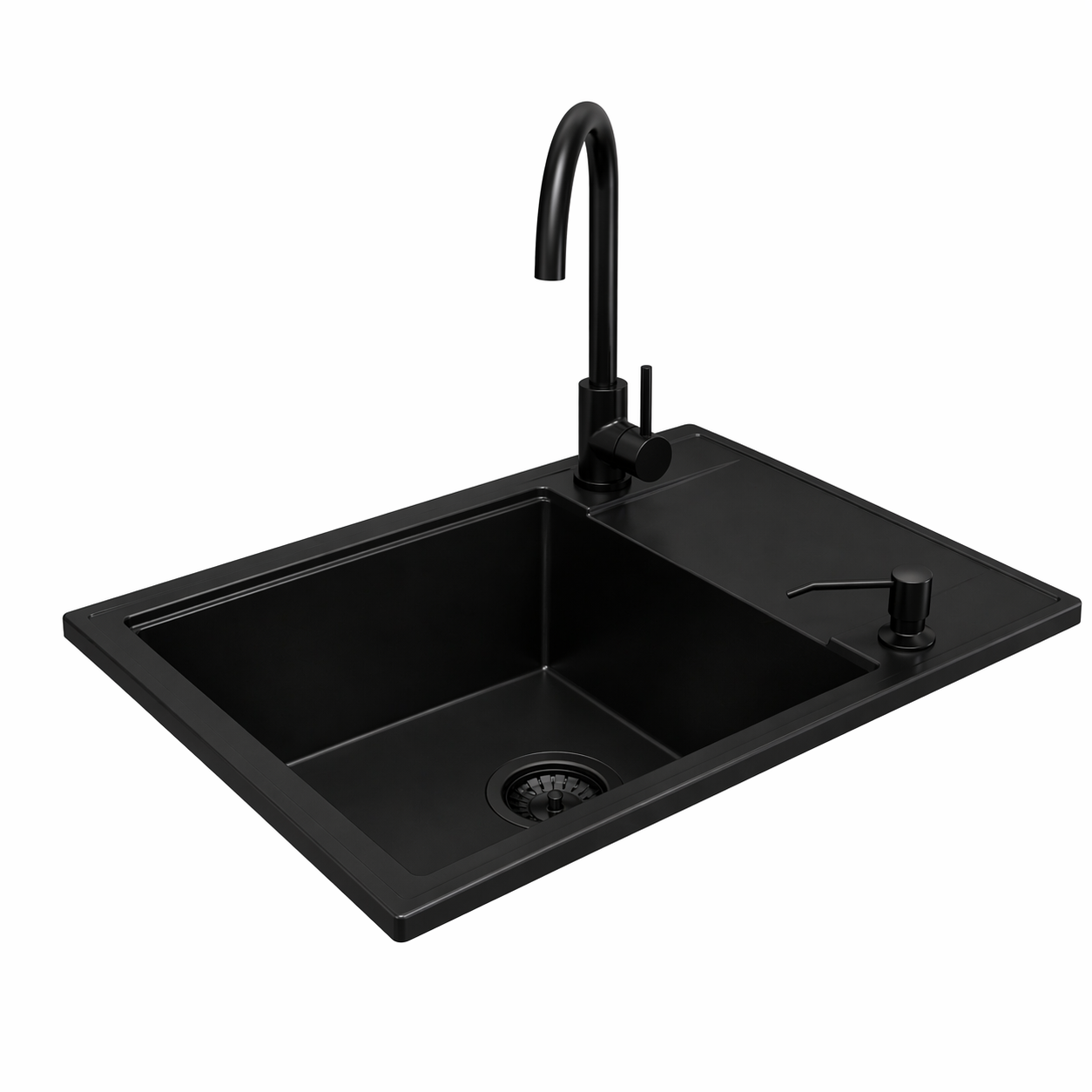 Jednokomorowa konstrukcja z ociekaczem zapewnia więcej przestrzeni roboczej i umożliwia wygodne suszenie naczyń, a specjalny rant funkcjonalny pozwala na odkładanie deski do krojenia lub ociekarki bezpośrednio na zlewie, zwiększając ergonomię pracy i maksymalnie wykorzystując dostępne miejsce. Zlewozmywak przeznaczony jest do szafek od 55 cm, co czyni go uniwersalnym rozwiązaniem do różnych aranżacji, a głęboka komora 20 cm zapewnia komfort podczas mycia dużych naczyń, garnków czy blach do pieczenia. Wykonanie w technologii NANO GRANIT gwarantuje odporność na wysoką temperaturę, zarysowania, uderzenia oraz intensywne użytkowanie, a gładka powierzchnia i zaokrąglone krawędzie ułatwiają utrzymanie czystości i ograniczają osadzanie się zabrudzeń. W zestawie znajduje się czarny syfon przyścienny SPACE SAVING PREMIUM, który oszczędza miejsce w szafce, umożliwia podłączenie zmywarki lub pralki oraz pozwala lepiej zorganizować przestrzeń pod zlewem. Stabilny montaż na zaczepy, dołączona instrukcja oraz kompletny zestaw sprawiają, że instalacja jest szybka i bezproblemowa.