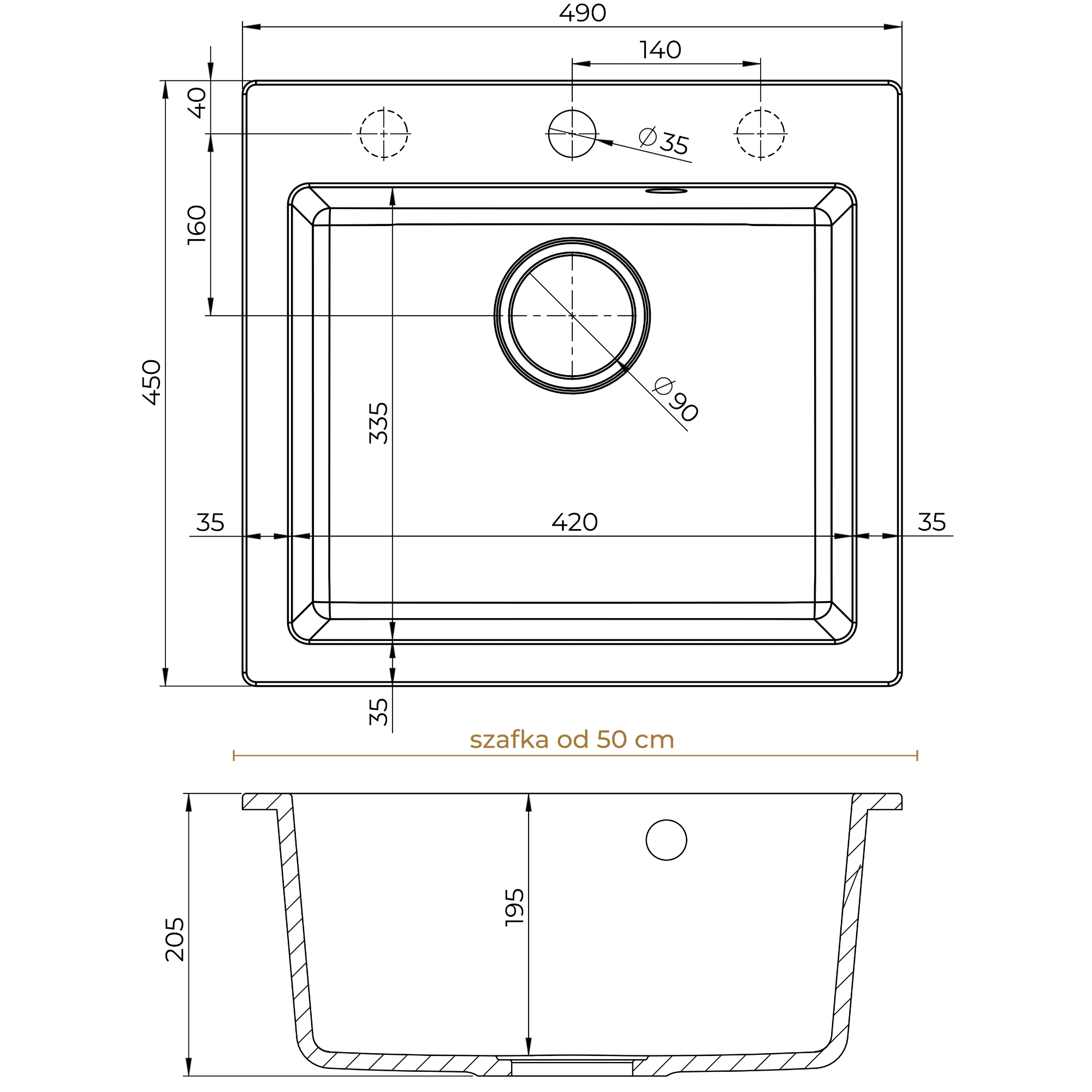 | Do szafki | od 50 cm |