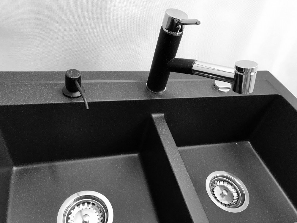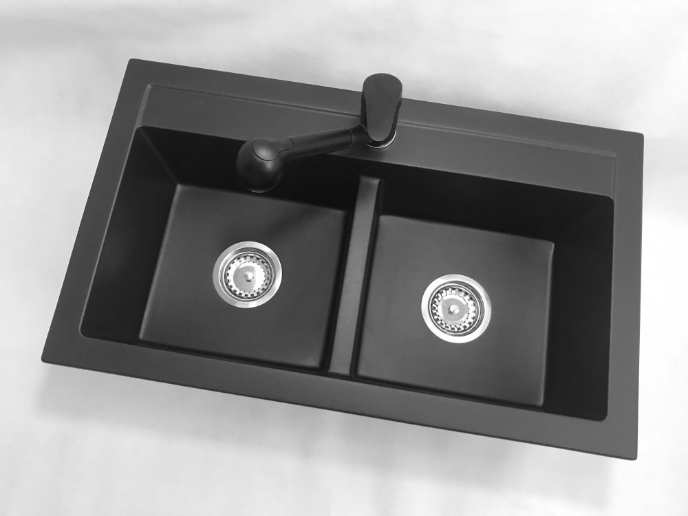 Zlewozmywak kuchenny zlew granitowy dwukomorowy czarny syfon czarny DARO