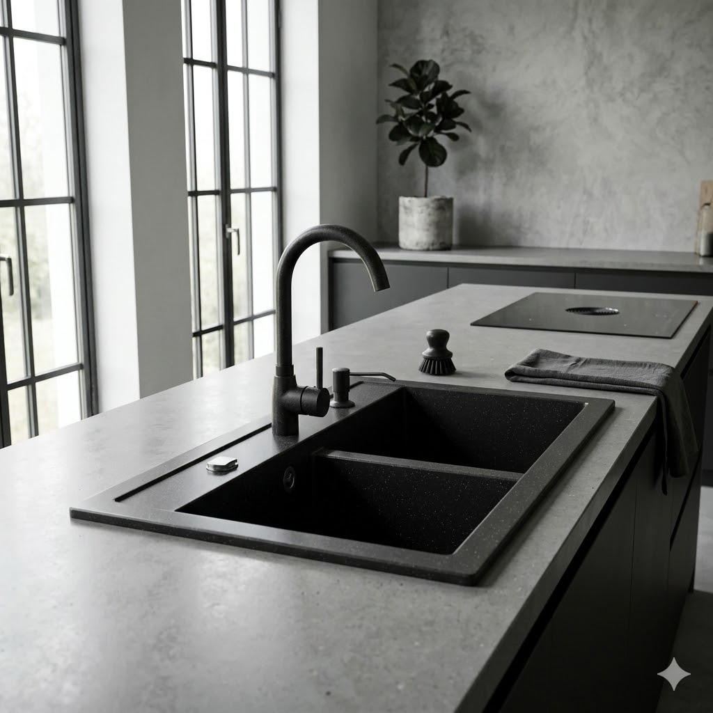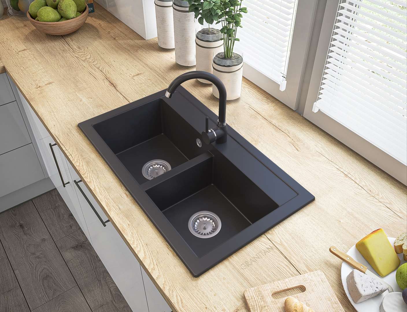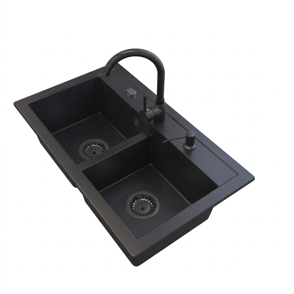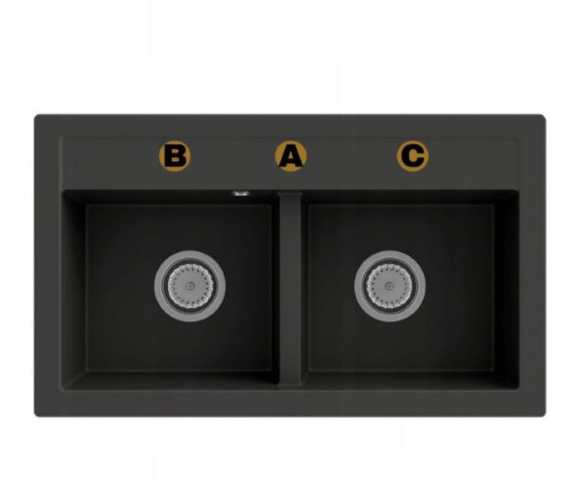 Model DARO to granitowy zlewozmywak dwukomorowy w eleganckim czarnym kolorze, który łączy nowoczesny design, wysoką trwałość oraz maksymalną wygodę użytkowania, dzięki czemu doskonale sprawdzi się w większych kuchniach i przy intensywnym, rodzinnym użytkowaniu. Dwukomorowa konstrukcja pozwala na jednoczesne wykonywanie różnych czynności, takich jak mycie, płukanie czy przygotowywanie produktów, co znacząco zwiększa komfort pracy i organizację przestrzeni roboczej. Zlewozmywak wykonany jest z materiału (80% kruszywo + 20% żywica), co zapewnia odporność na zarysowania, uderzenia oraz wysoką temperaturę, a jego matowe wykończenie nie tylko prezentuje się elegancko, ale również ułatwia utrzymanie czystości na co dzień. Model DARO został zaprojektowany z myślą o osobach, które oczekują praktycznych rozwiązań i niezawodności, dlatego świetnie sprawdzi się zarówno w nowoczesnych, jak i klasycznych aranżacjach kuchni. Dodatkowym atutem jest możliwość bezpłatnego wykonania otworów (A, B, C), co pozwala na pełne dopasowanie zlewozmywaka do baterii kuchennej, dozownika płynu lub korka automatycznego według indywidualnych potrzeb użytkownika. W zestawie znajduje się czarny syfon przyścienny Space Saving, którego spłaszczona konstrukcja pozwala maksymalnie wykorzystać przestrzeń w szafce, zapewnia łatwy dostęp do instalacji oraz umożliwia podłączenie zmywarki lub pralki, zwiększając funkcjonalność całego systemu.