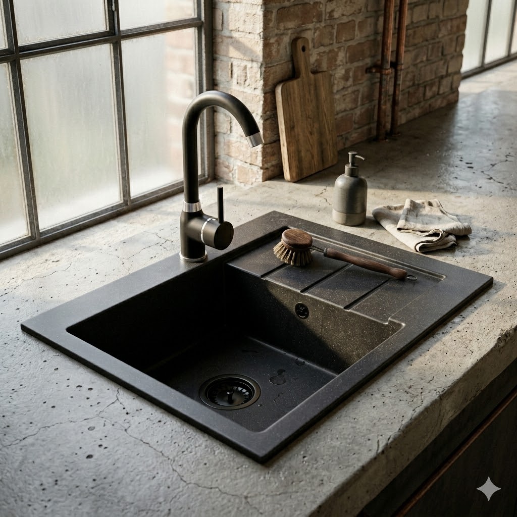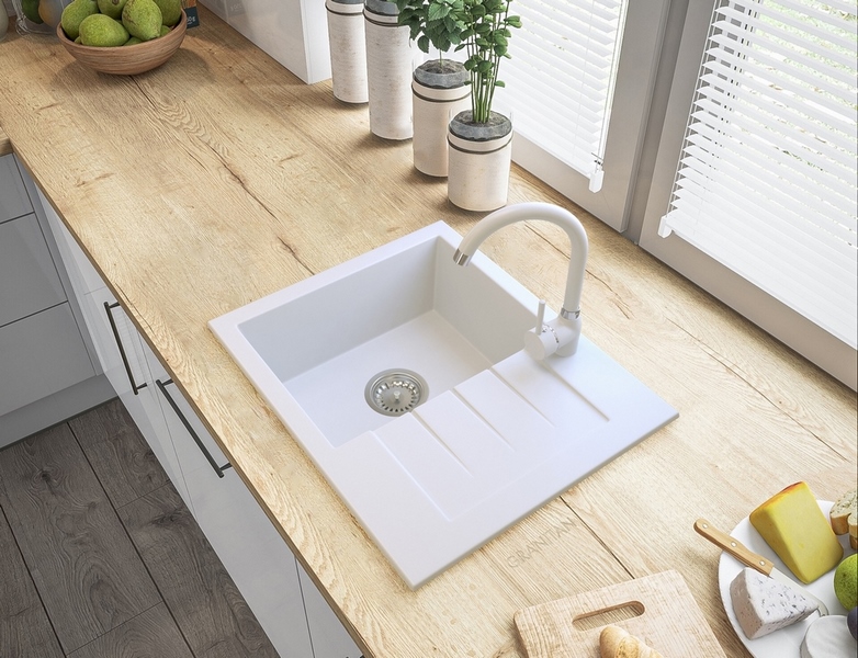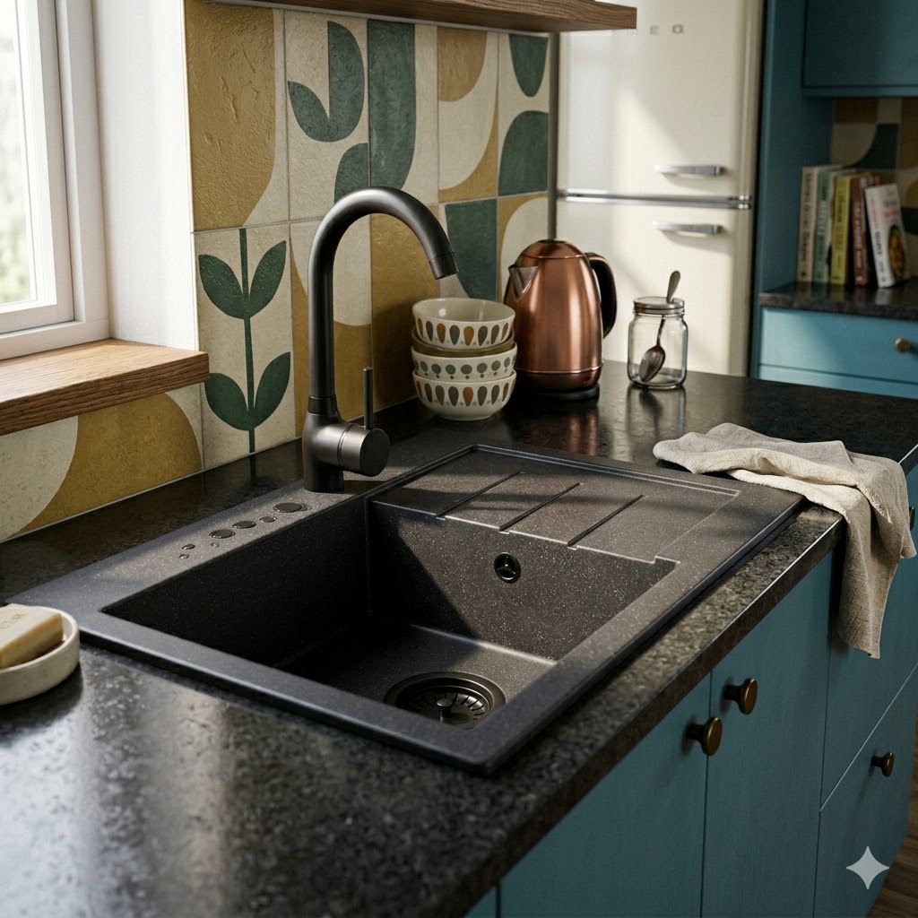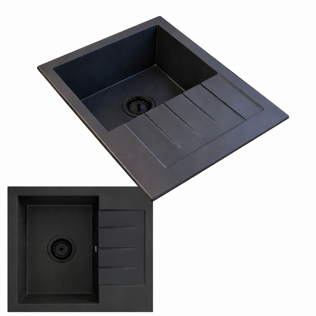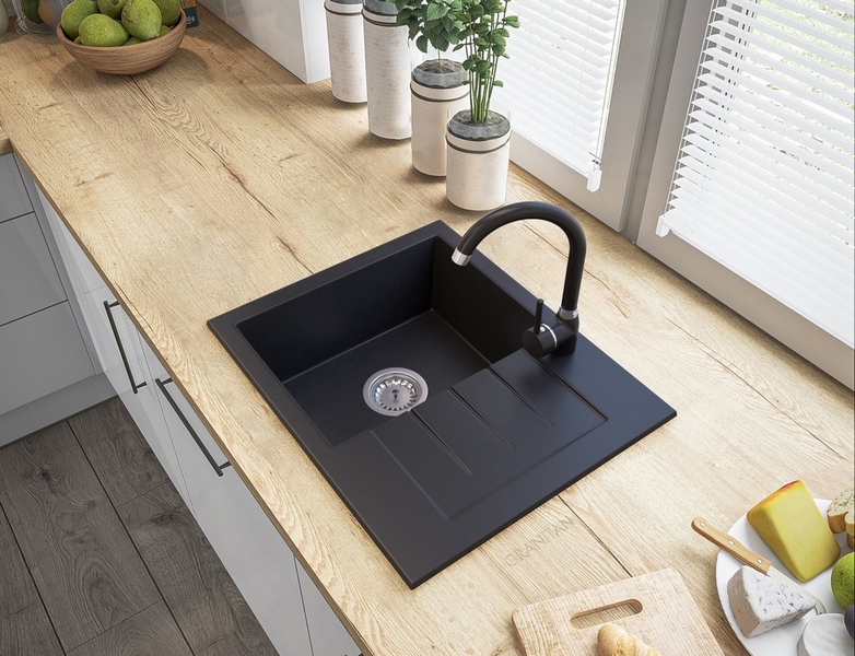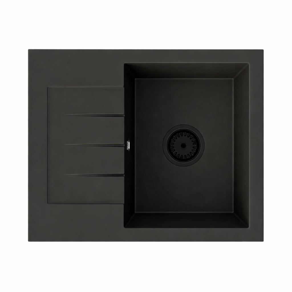 Model GORT to granitowy zlewozmywak jednokomorowy z ociekaczem w eleganckim czarnym kolorze, który łączy nowoczesny design, wysoką trwałość oraz elastyczność dopasowania do układu kuchni, dzięki czemu sprawdzi się zarówno w mniejszych, jak i średnich przestrzeniach.