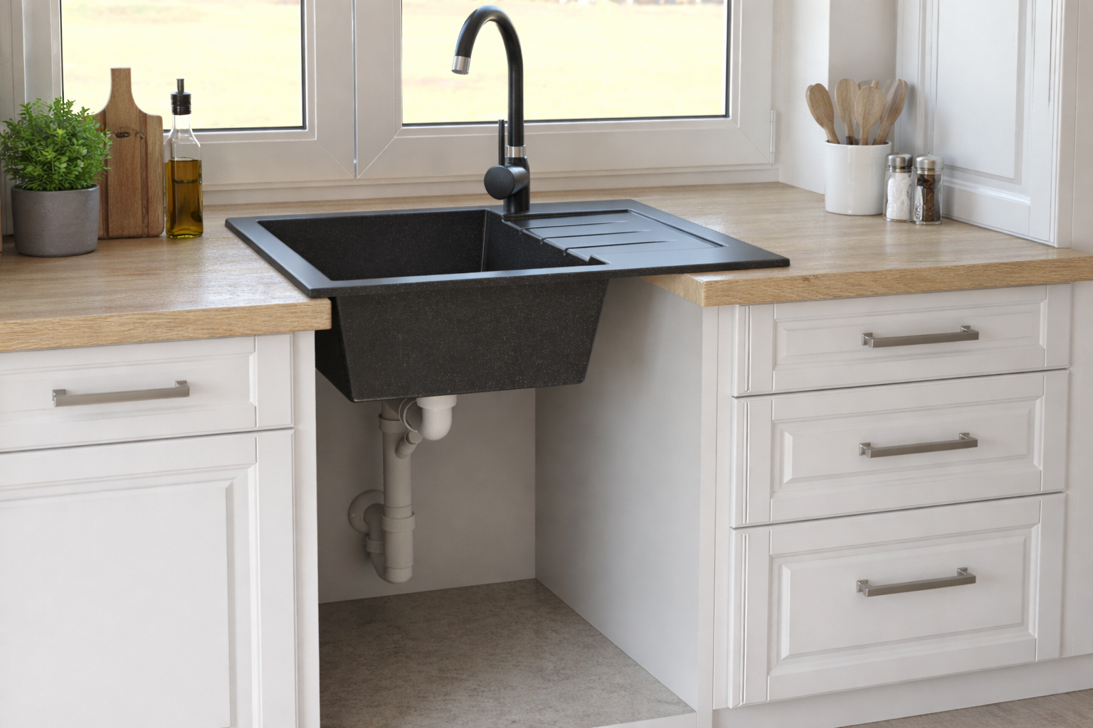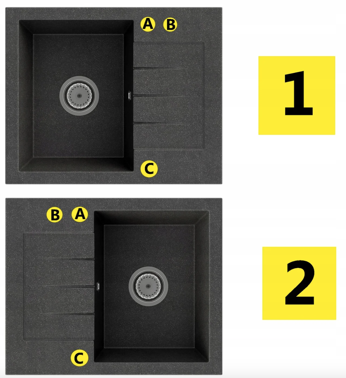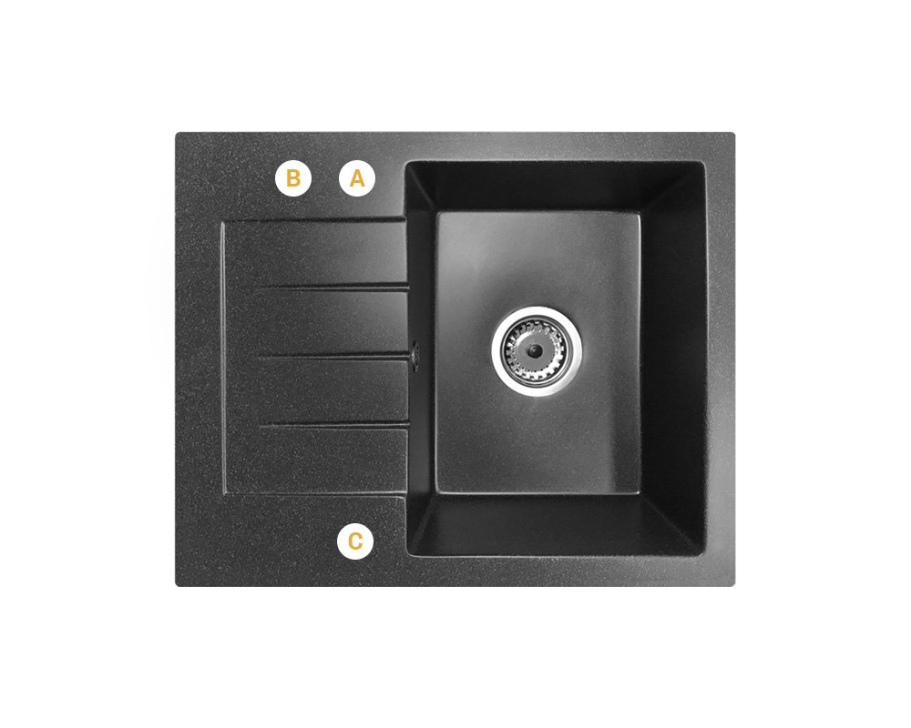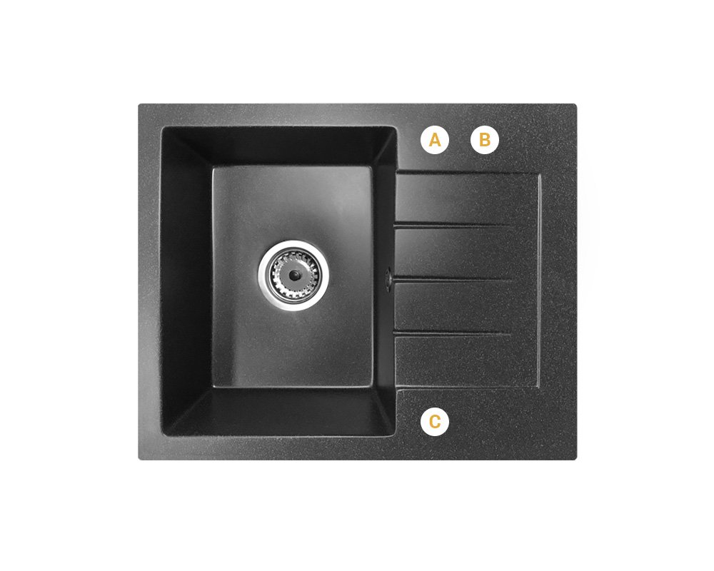 Odwracalna konstrukcja pozwala na montaż komory po lewej lub prawej stronie, co daje pełną swobodę aranżacji, a praktyczny ociekacz zwiększa powierzchnię roboczą i ułatwia suszenie naczyń oraz organizację pracy. Zlewozmywak wykonany jest z materiału (80% kruszywo + 20% żywica), co zapewnia odporność na zarysowania, temperaturę oraz codzienne użytkowanie, a jego matowa, czarna powierzchnia nadaje kuchni elegancki i nowoczesny charakter, jednocześnie ułatwiając utrzymanie czystości. Kompaktowy rozmiar sprawia, że model GORT idealnie pasuje do mniejszych kuchni i aneksów, nie tracąc przy tym na funkcjonalności. Dodatkowym atutem jest możliwość bezpłatnego wykonania otworów (A, B, C) oraz wyboru strony komory (lewa lub prawa), co pozwala w pełni dopasować zlewozmywak do baterii kuchennej, dozownika płynu lub korka automatycznego, a brak informacji skutkuje wysyłką produktu bez nawierconych otworów. W zestawie znajduje się czarny syfon manualny przyścienny, który oszczędza miejsce w szafce, zapewnia wygodne użytkowanie oraz umożliwia podłączenie zmywarki lub pralki, zwiększając funkcjonalność całej instalacji.