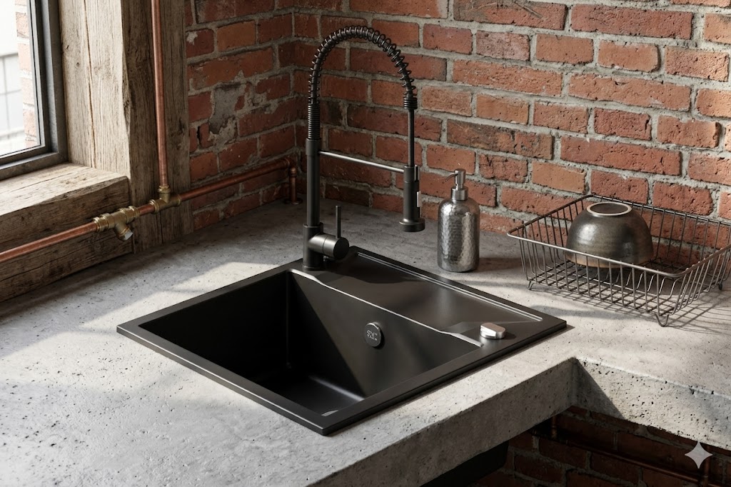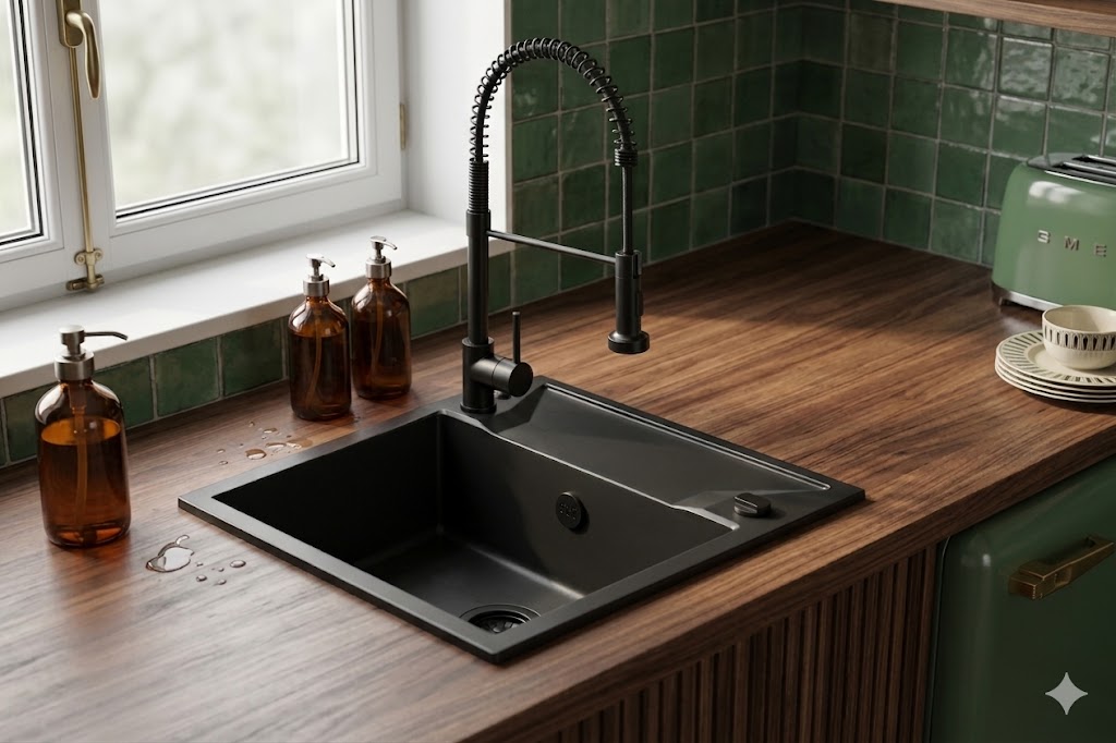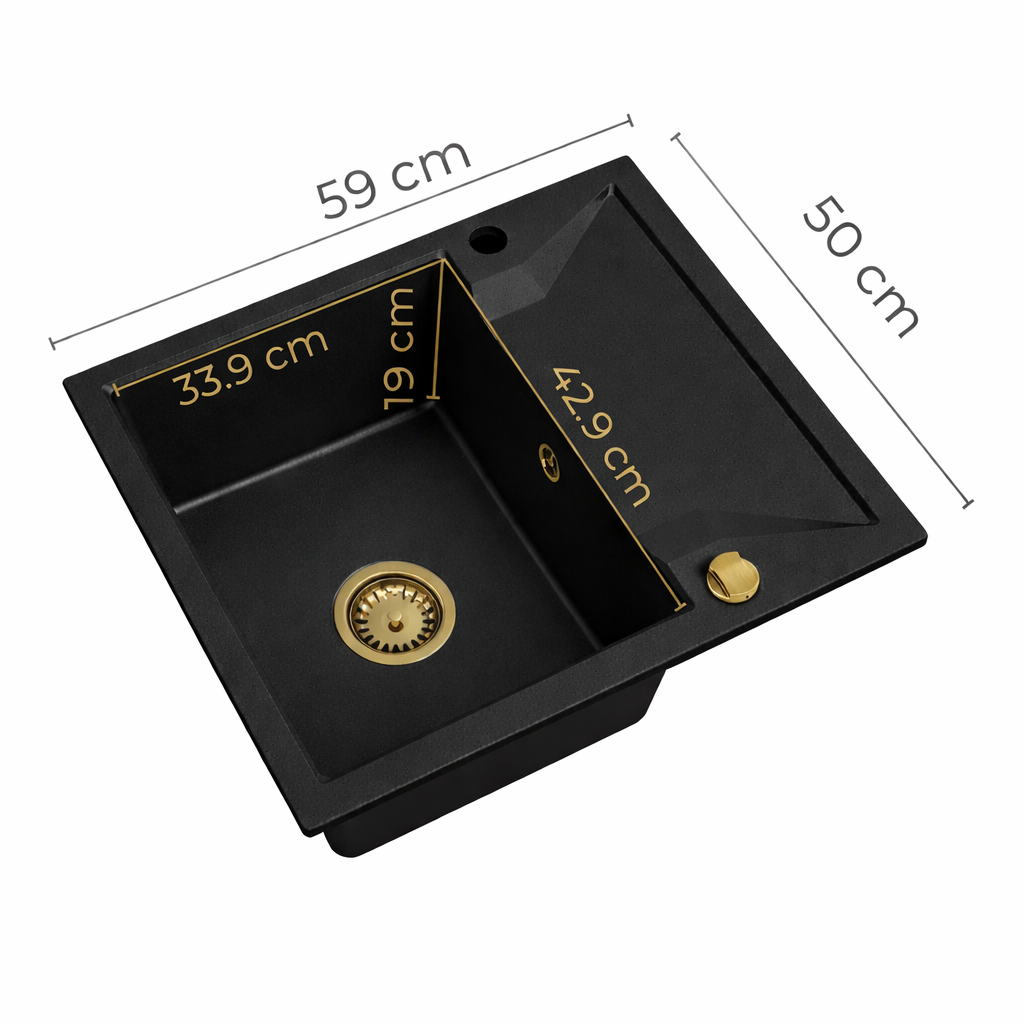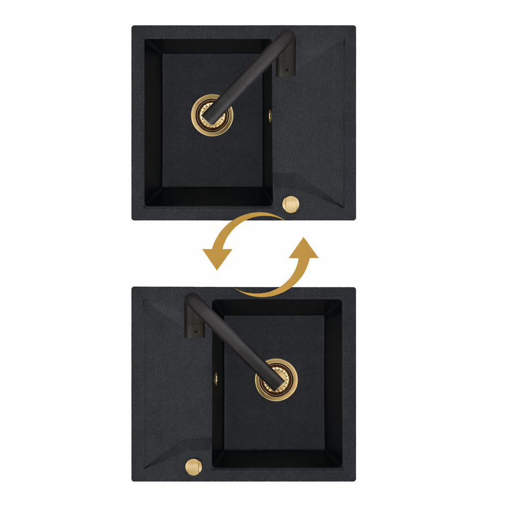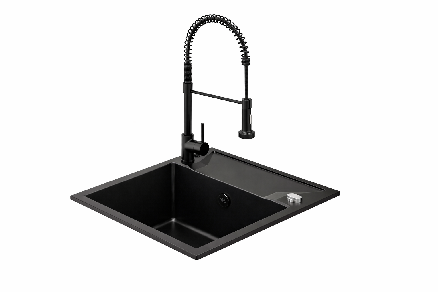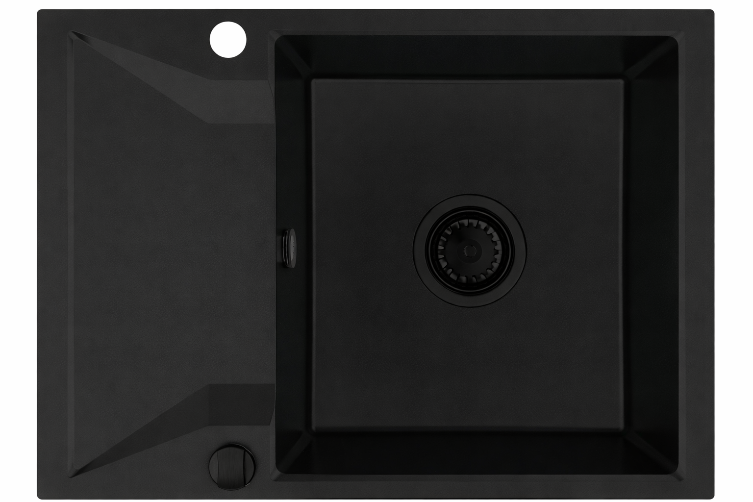 Model SADO to granitowy zlewozmywak jednokomorowy w eleganckim czarnym kolorze, który łączy trwałość, praktyczność i uniwersalny design, dzięki czemu doskonale sprawdzi się w większości kuchni – zarówno mniejszych, jak i średnich.