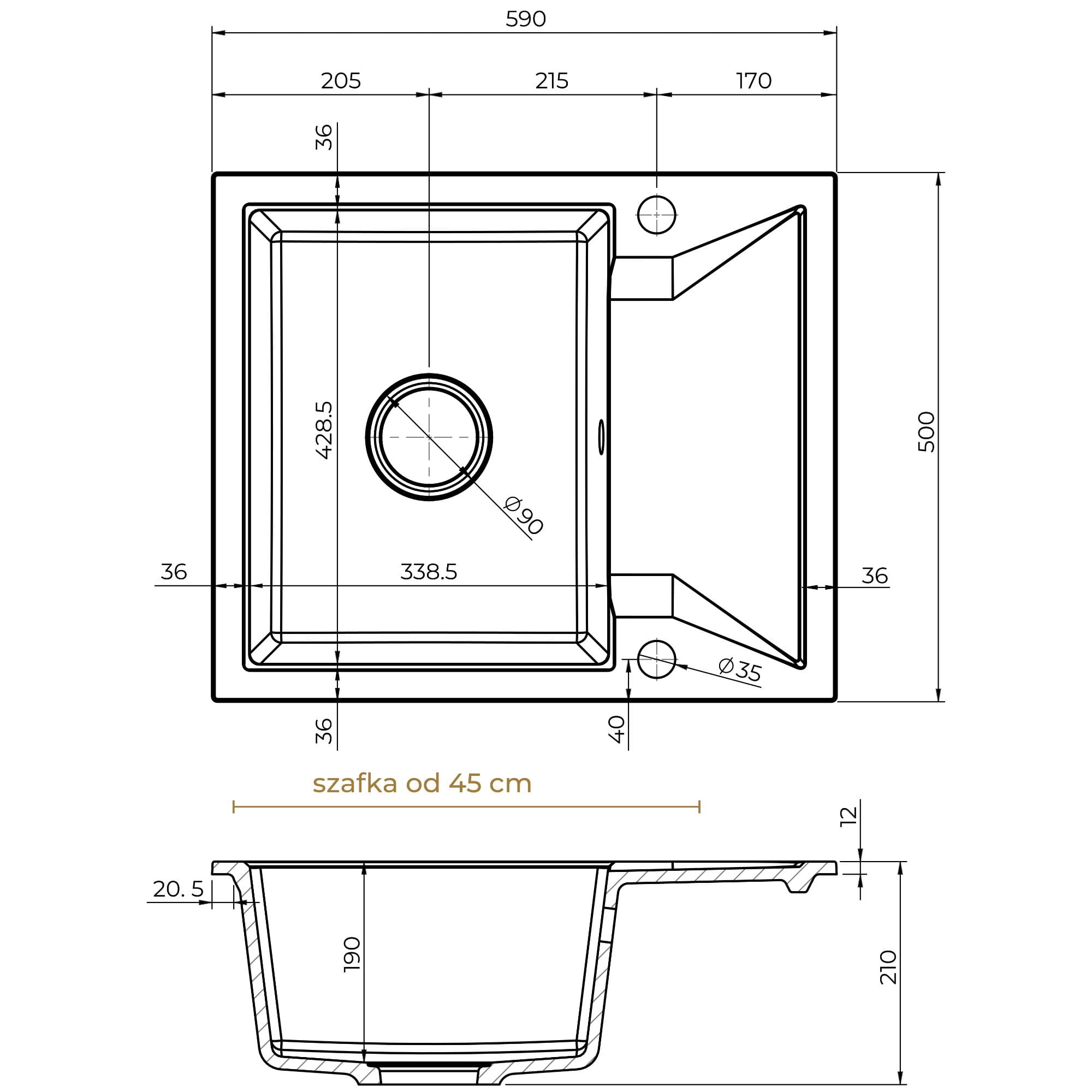 Jednokomorowa konstrukcja z ociekaczem zapewnia większą przestrzeń roboczą i ułatwia suszenie naczyń oraz organizację pracy, a odwracalny układ (ociekacz lewy lub prawy) pozwala dopasować zlewozmywak do indywidualnego układu kuchni. Zlewozmywak wykonany jest w technologii NANO GRANIT, co gwarantuje odporność na wysoką temperaturę, zarysowania oraz uderzenia, a głęboka komora 190 mm zapewnia komfortowe mycie nawet większych naczyń i garnków. Gładka powierzchnia oraz zaokrąglone krawędzie ograniczają osadzanie się zabrudzeń i ułatwiają utrzymanie czystości, co przekłada się na większą higienę i wygodę użytkowania. Model SADO przeznaczony jest do szafek od 45 cm, co czyni go bardzo uniwersalnym rozwiązaniem do różnych przestrzeni kuchennych. Dodatkowym atutem są fabryczne otwory (A i B), które można wykorzystać pod baterię, dozownik lub pokrętło syfonu, w zależności od wybranej konfiguracji. W zestawie znajduje się czarny syfon przyścienny SPACE SAVING PREMIUM, który oszczędza miejsce w szafce, umożliwia podłączenie zmywarki lub pralki oraz zapewnia wygodny dostęp do instalacji. Stabilny montaż na zaczepy, komplet akcesoriów oraz dołączona instrukcja sprawiają, że instalacja jest szybka i bezproblemowa.