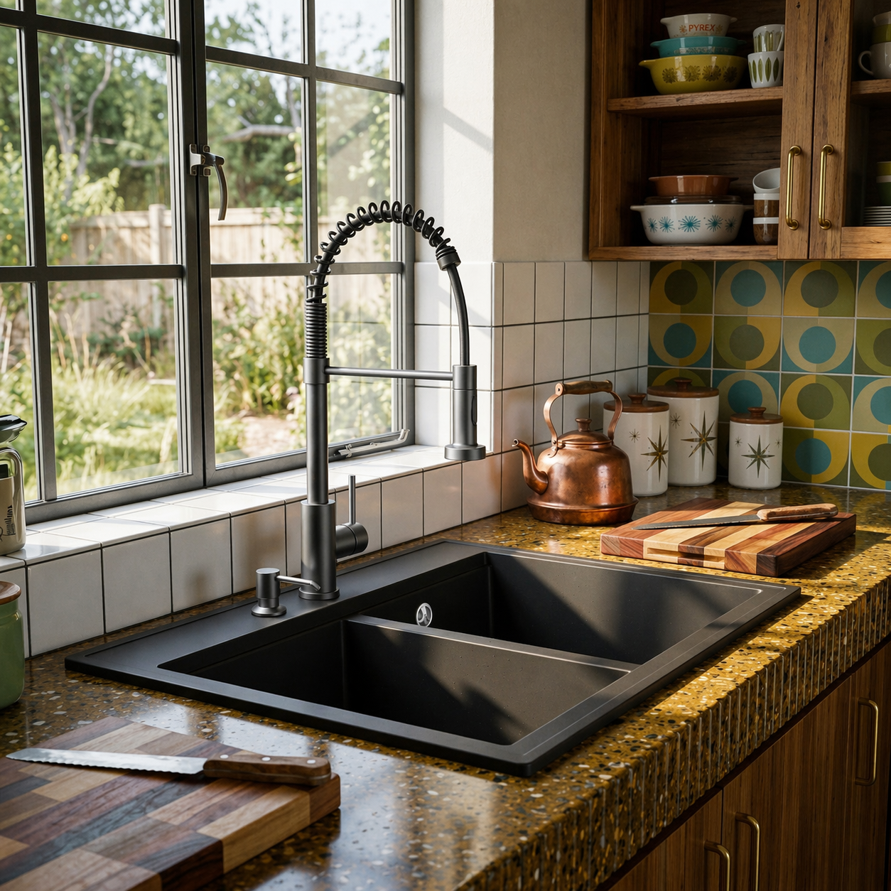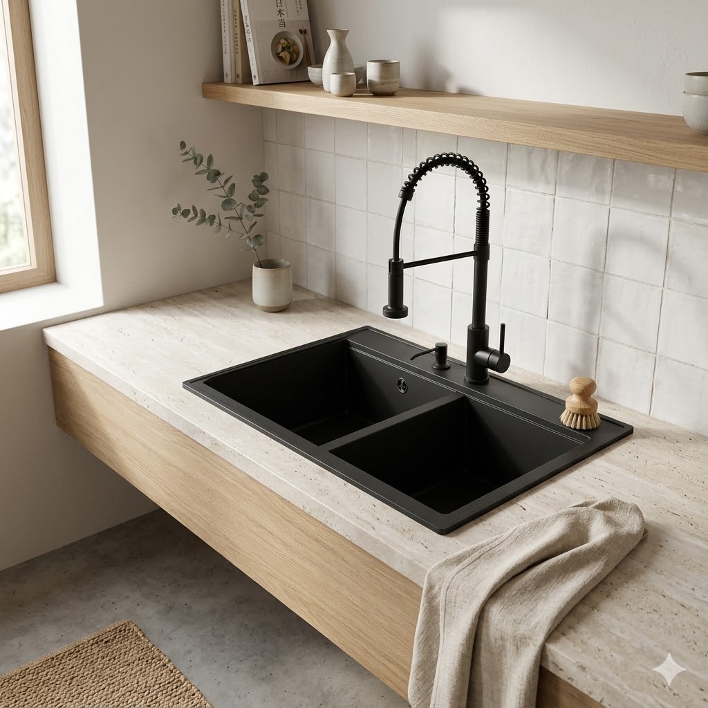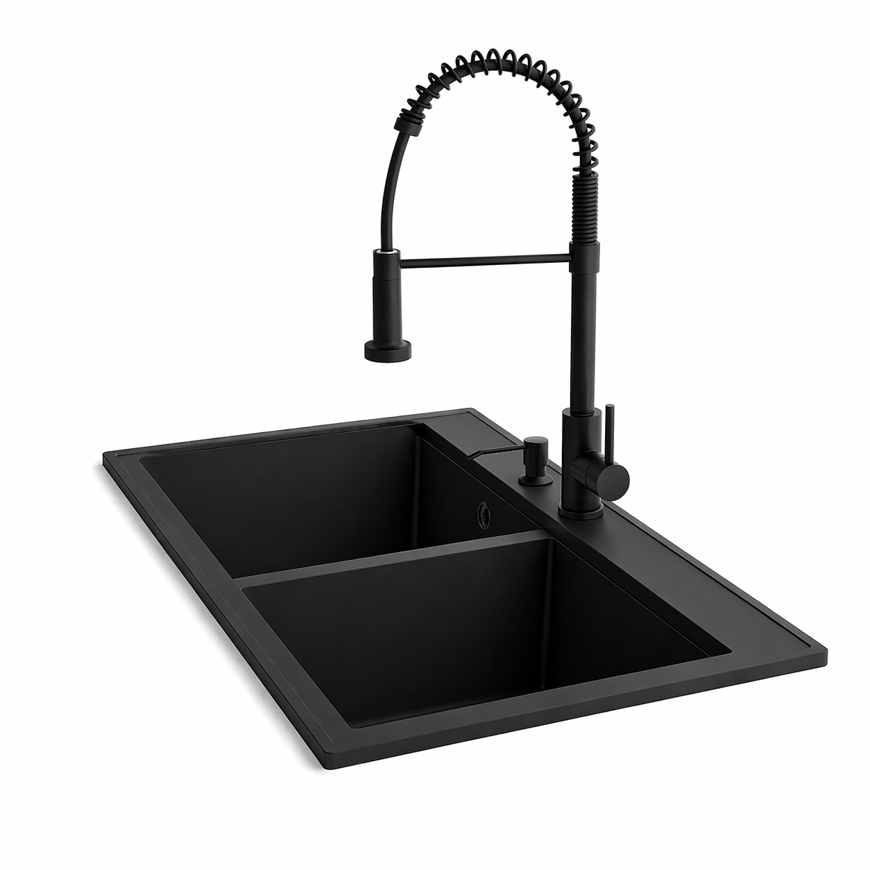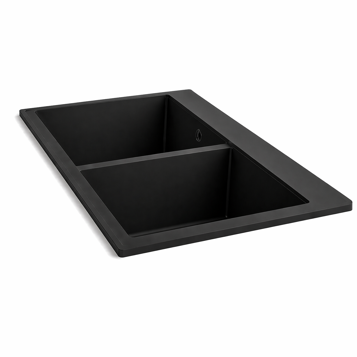 Model SILO to granitowy zlewozmywak dwukomorowy w eleganckim czarnym kolorze, który łączy wysoką funkcjonalność, trwałość oraz nowoczesny design, dzięki czemu doskonale sprawdzi się w przestronnych kuchniach oraz u osób, które często gotują.