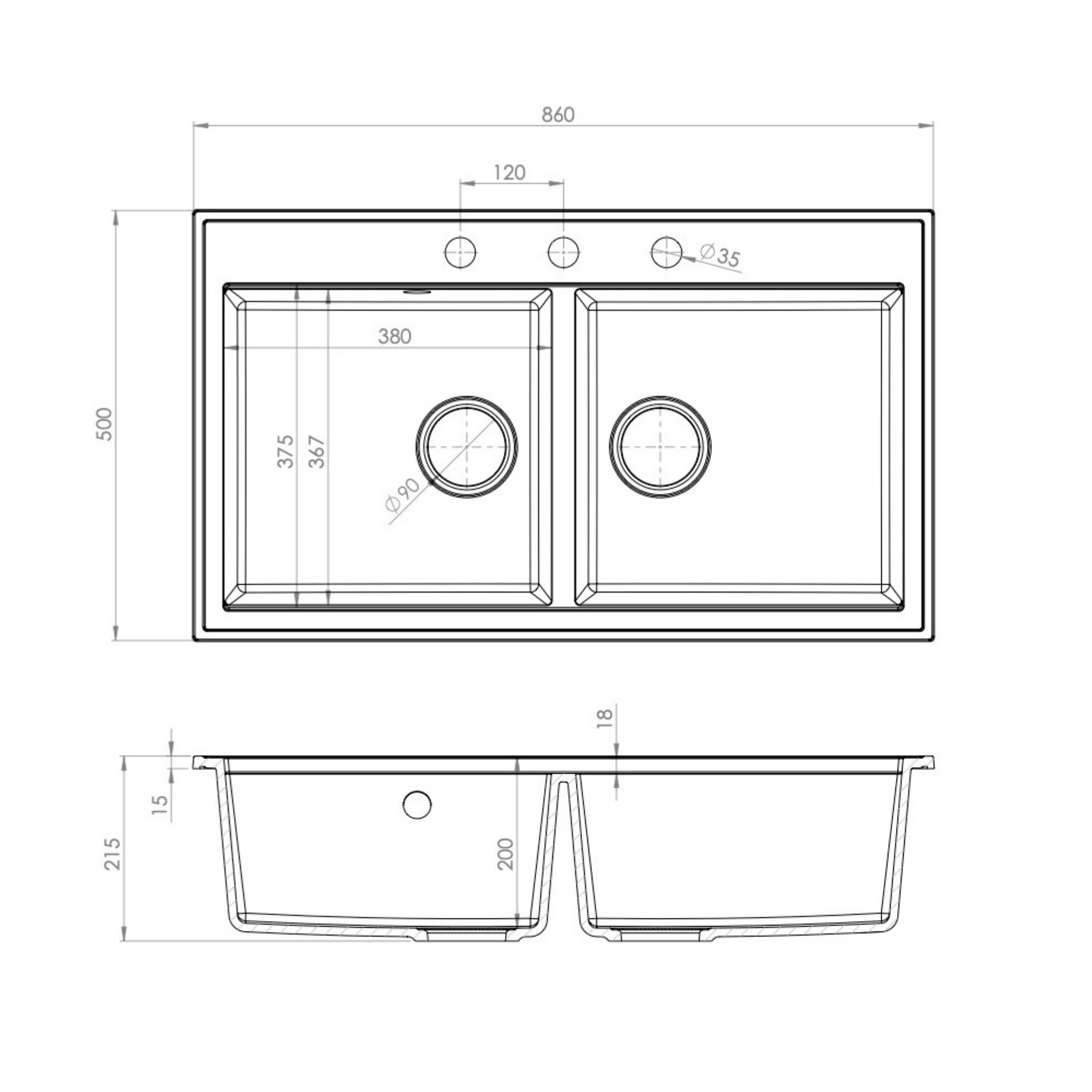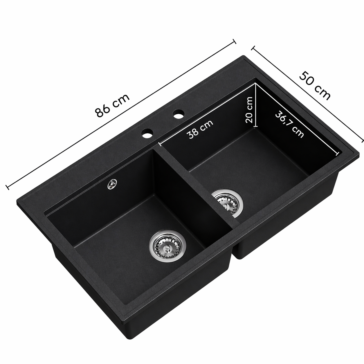 Dwie głębokie komory umożliwiają jednoczesne wykonywanie różnych czynności – mycie, płukanie czy przygotowywanie produktów – co znacząco przyspiesza codzienną pracę i poprawia organizację przestrzeni. Duże wymiary 86 x 50 cm oraz głębokość komór 21,5 cm zapewniają wygodę nawet przy myciu dużych garnków i naczyń, a przeznaczenie do szafek od 85 cm gwarantuje odpowiednią przestrzeń roboczą i komfort użytkowania. Zlewozmywak wykonany jest w technologii NANO GRANIT, co zapewnia odporność na wysoką temperaturę, zarysowania, uderzenia oraz intensywne użytkowanie, dzięki czemu zachowuje estetyczny wygląd i trwałość przez lata. Gładka powierzchnia i zaokrąglone krawędzie ułatwiają utrzymanie czystości i ograniczają osadzanie się zabrudzeń. Dodatkowym atutem jest możliwość dopasowania otworów w zależności od konfiguracji akcesoriów, co pozwala dostosować zlew do indywidualnych potrzeb. W zestawie znajduje się czarny syfon przyścienny SPACE SAVING PREMIUM, który oszczędza miejsce w szafce, umożliwia podłączenie zmywarki lub pralki oraz pozwala zachować porządek pod zlewem. Stabilny montaż na zaczepy, dołączona instrukcja oraz kompletny zestaw sprawiają, że instalacja jest szybka i bezproblemowa.