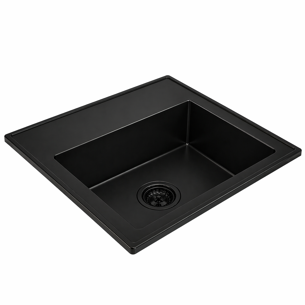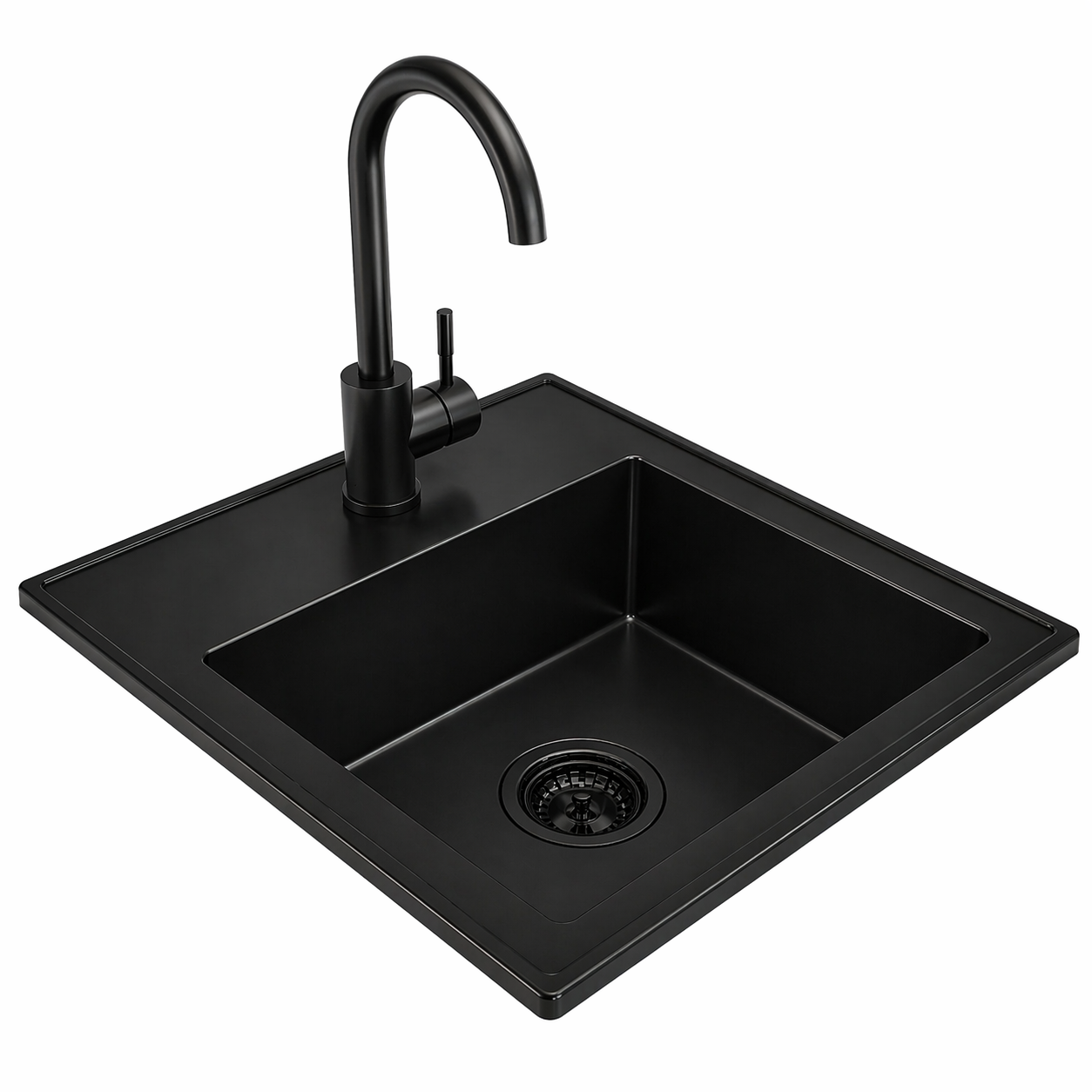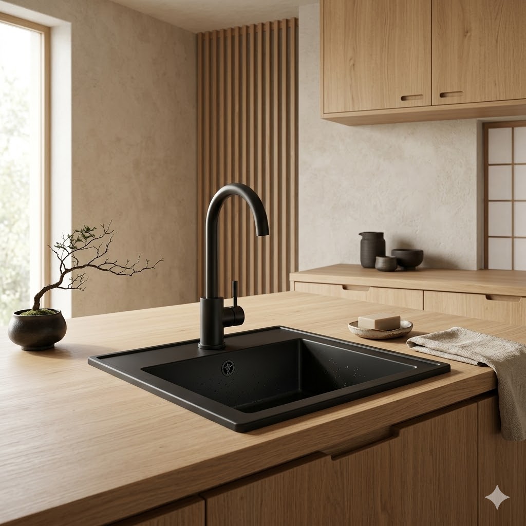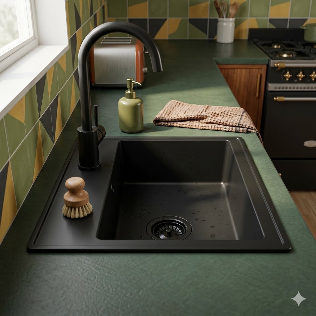 Model VELA to granitowy zlewozmywak jednokomorowy w eleganckim czarnym kolorze, zaprojektowany z myślą o maksymalnym wykorzystaniu przestrzeni i wygodzie codziennego użytkowania, dzięki czemu doskonale sprawdzi się w mieszkaniach, kawalerkach oraz kuchniach o ograniczonej powierzchni.