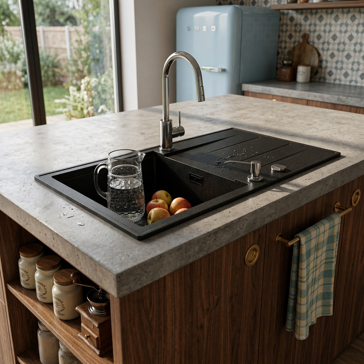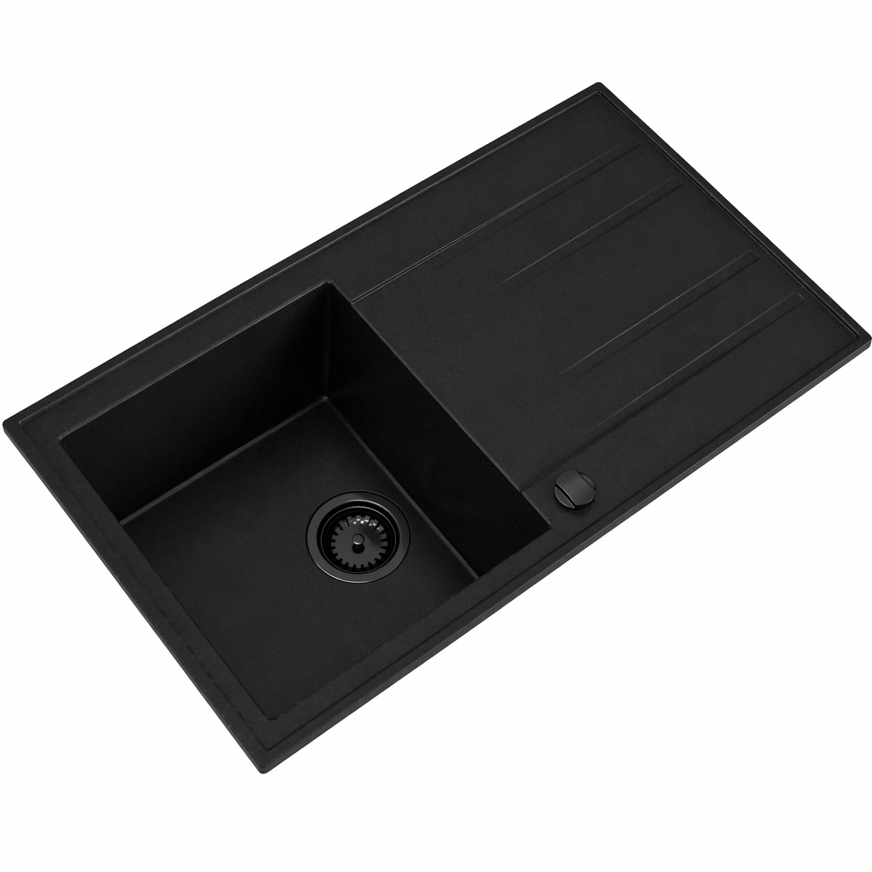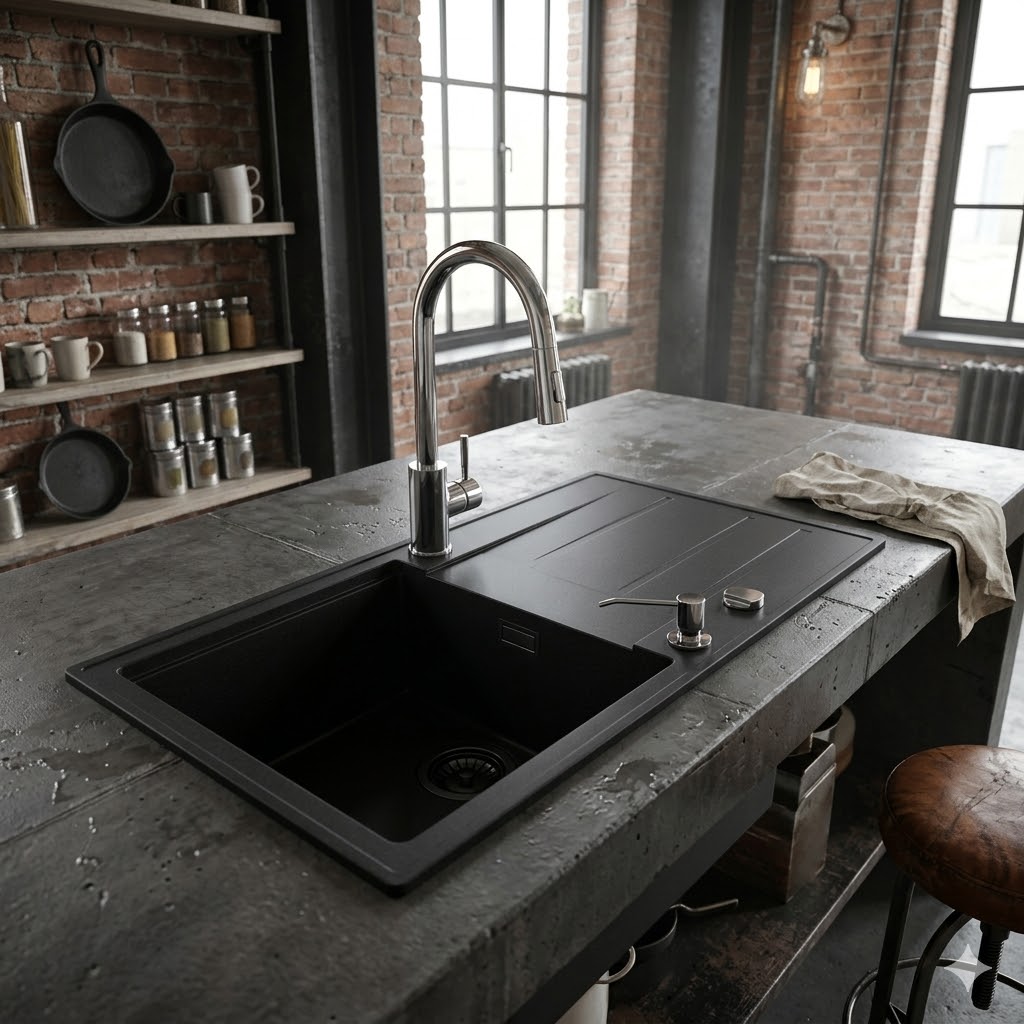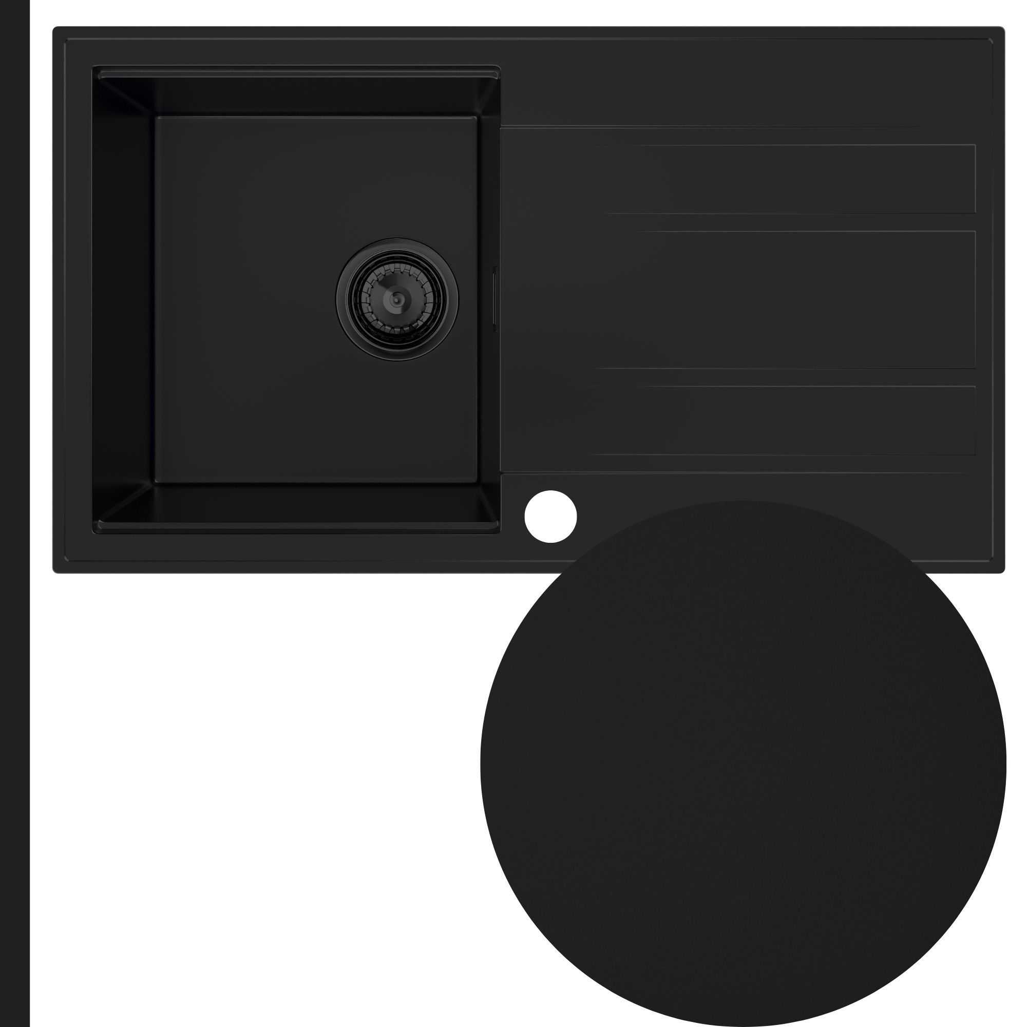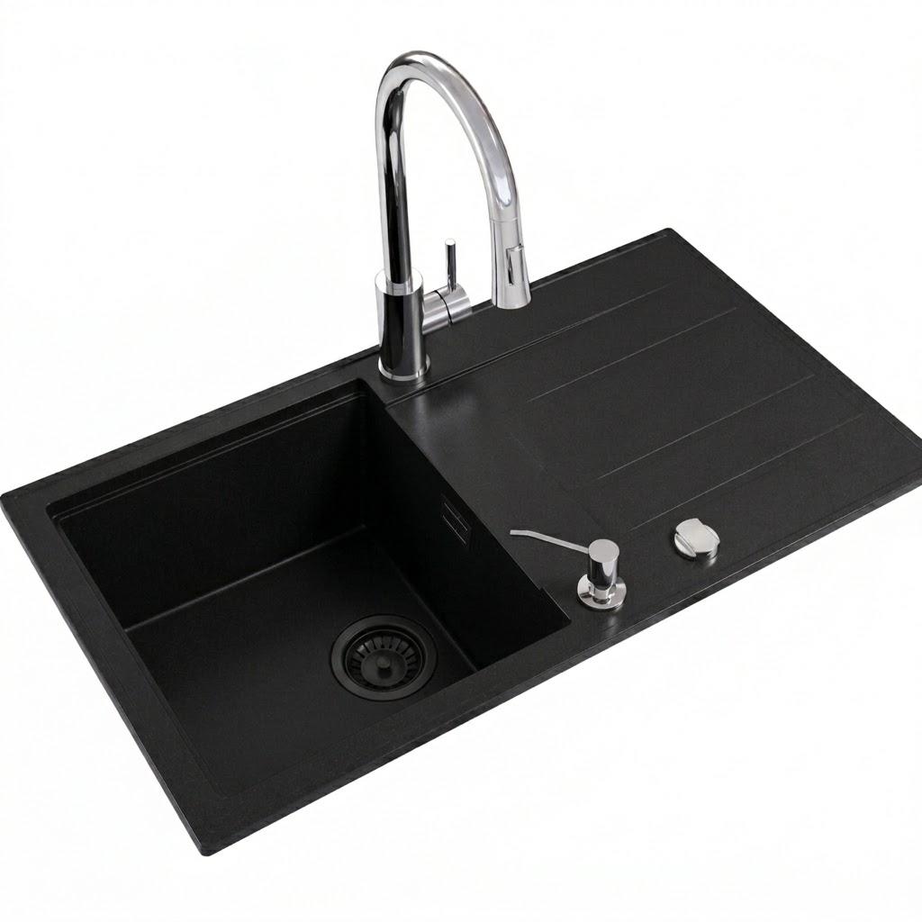 Model VONA to granitowy zlewozmywak jednokomorowy z ociekaczem w eleganckim czarnym kolorze, który łączy trwałość, wygodę oraz przemyślaną konstrukcję, dzięki czemu doskonale pasuje do średnich i większych kuchni.