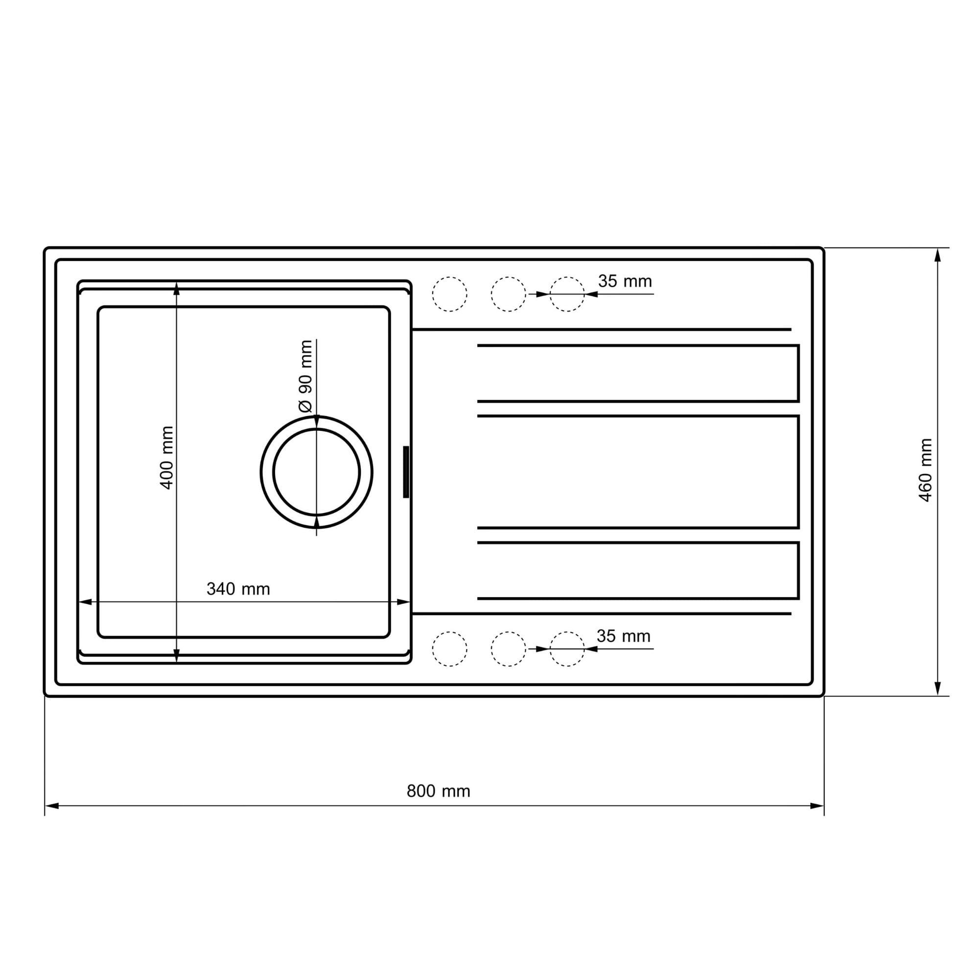 Jednokomorowa konstrukcja z ociekaczem zapewnia więcej miejsca do pracy, umożliwia wygodne suszenie naczyń oraz lepszą organizację przestrzeni bez potrzeby korzystania z dodatkowych akcesoriów. Duże wymiary 80 x 46 cmgwarantują komfort podczas codziennych czynności, a możliwość montażu w szafkach od 55 cm sprawia, że model jest uniwersalnym rozwiązaniem do wielu aranżacji. Zlewozmywak wykonany jest w technologii NANO GRANIT, co zapewnia odporność na wysoką temperaturę, szok termiczny, zarysowania, uderzenia oraz zabrudzenia, dzięki czemu zachowuje estetyczny wygląd przez długi czas. Gładka powierzchnia i zaokrąglone krawędzie ułatwiają czyszczenie i ograniczają osadzanie się osadów, zwiększając komfort użytkowania. Dodatkowym atutem są fabryczne otwory (A i B) o średnicy 35 mm, które umożliwiają elastyczne dopasowanie konfiguracji pod baterię kuchenną, dozownik lub pokrętło syfonu, zgodnie z indywidualnymi potrzebami. W zestawie znajduje się czarny syfon przyścienny SPACE SAVING PREMIUM, który oszczędza miejsce w szafce, umożliwia podłączenie zmywarki lub pralki oraz pozwala zachować porządek pod zlewem. Stabilny montaż na zaczepy, komplet akcesoriów oraz dołączona instrukcja sprawiają, że instalacja jest szybka i bezproblemowa.