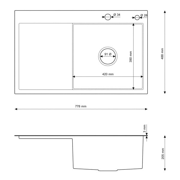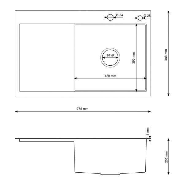 Jednokomorowy zlewozmywak z ociekaczem przeznaczony do montażu nablatowego. Zlew posiada dwa otwory (przykryte estetyczną zaślepką w kolorze zlewu) przeznaczone na baterię kuchenną i dozownik do płynu. Zlew w 2 kolorach do wyboru.