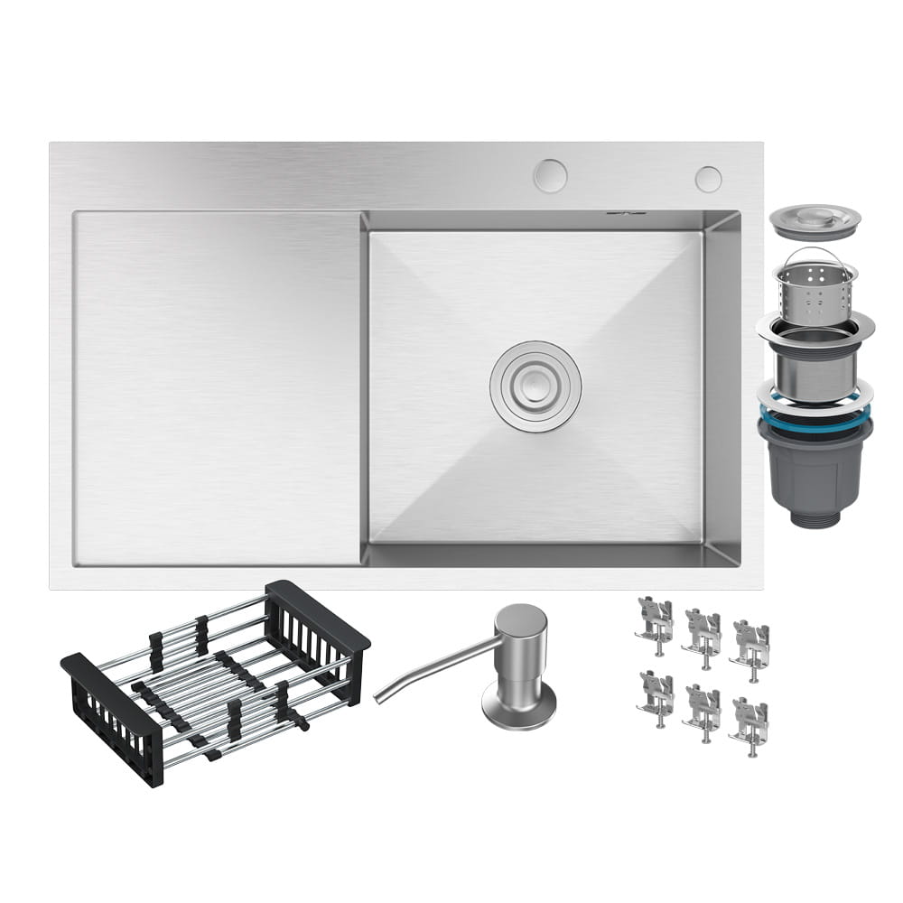 W skład zestawu wchodzą: zlewozmywak, syfon przyścienny manualny, teleskopowa ociekarka do zlewu, dozownik na płyn w kolorze zlewu, mocowania do zlewu w kolorze chrom, mata wygłuszająca.
